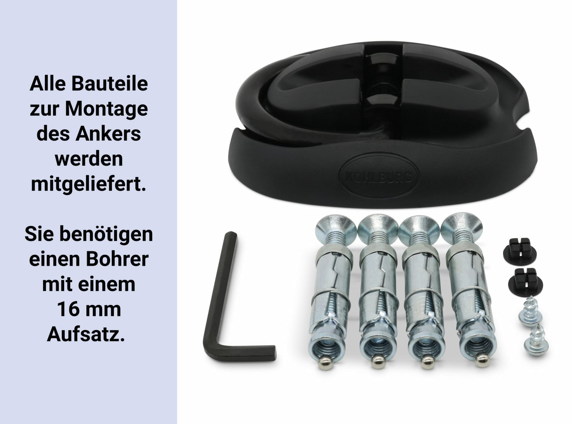 Der Anker besteht aus gehärtetem und rostfreien Spezialstahl und wird zusätzlich von einer robusten Kunststoff-Schale bedeckt. Dank dieser wetterfesten Materialien kann der Anker sowohl in Gebäuden als auch draußen montiert werden. Die Montage erfordert handwerkliches Geschick. Alle notwendigen Befestigungsmaterialien werden mitgeliefert. Zur Montage wird ein Bohrer mit einem 16 mm Bohraufsatz sowie ein Hammer und ein Schraubenzieher benötigt. Eine verständliche Montageanleitung in Deutsch wird mitgeliefert.