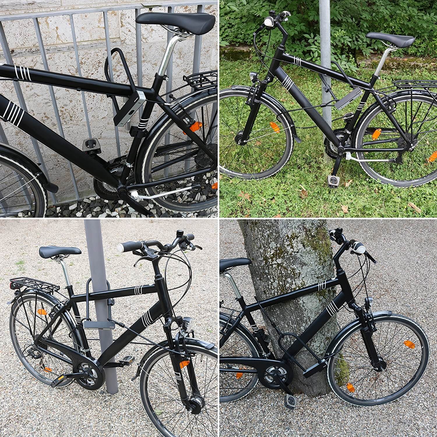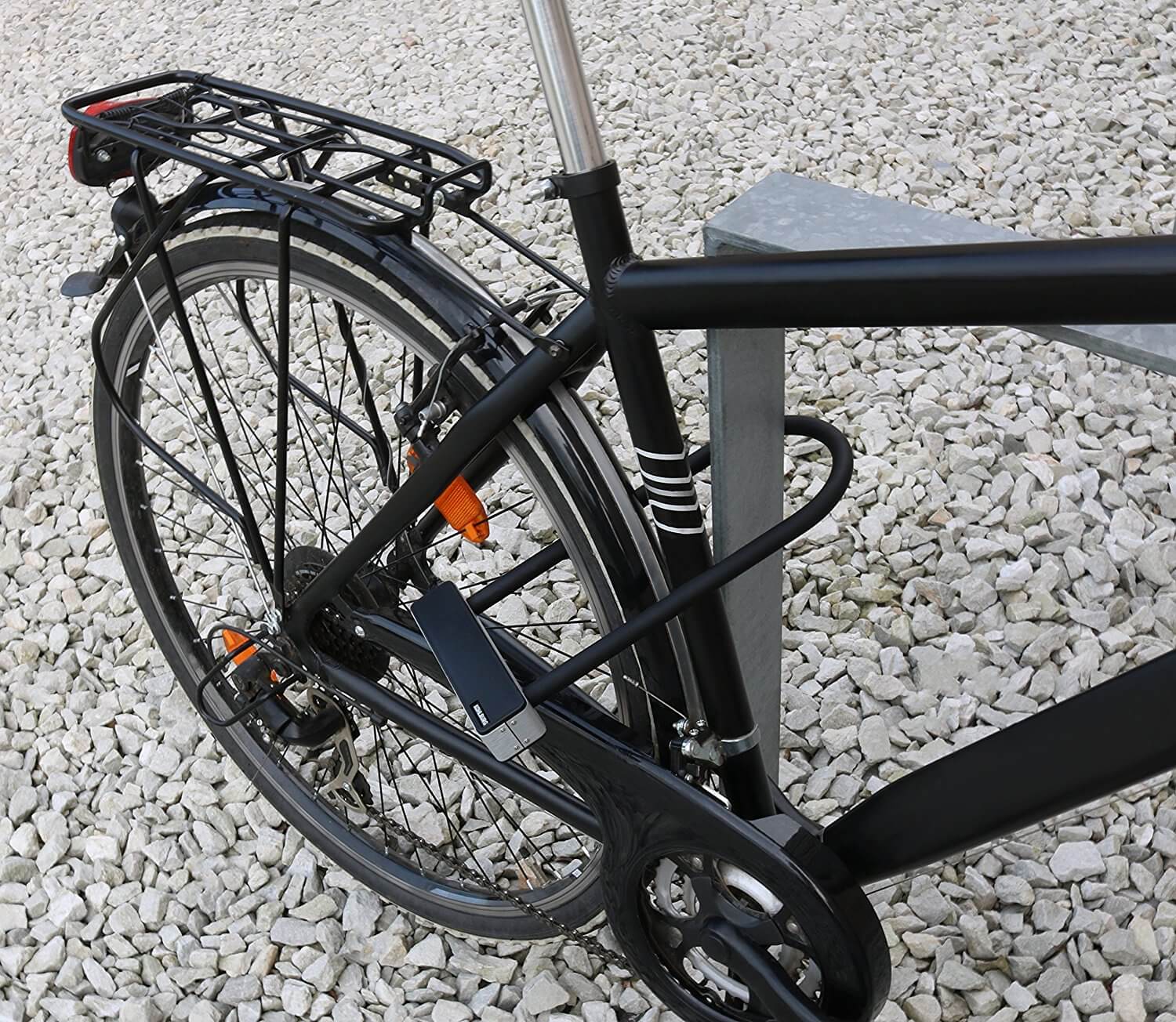 - ZUSÄTZLICHES SICHERHEITSKABEL – das zusätzliche Sicherheitskabel mit einer Länge von 1,80 m sorgt dafür, dass Sie neben dem Rahmen auch Vorder- und Hinterrad, sowie zusätzliches Fahrrad-Zubehör wie Anhänger, Kindersitze oder Helme sicher anschließen können; das Kabel besitzt aufgund seiner dünneren und flexibleren Struktur allerdings nicht das gleich Schutzniveau, wie das Bügelschloss