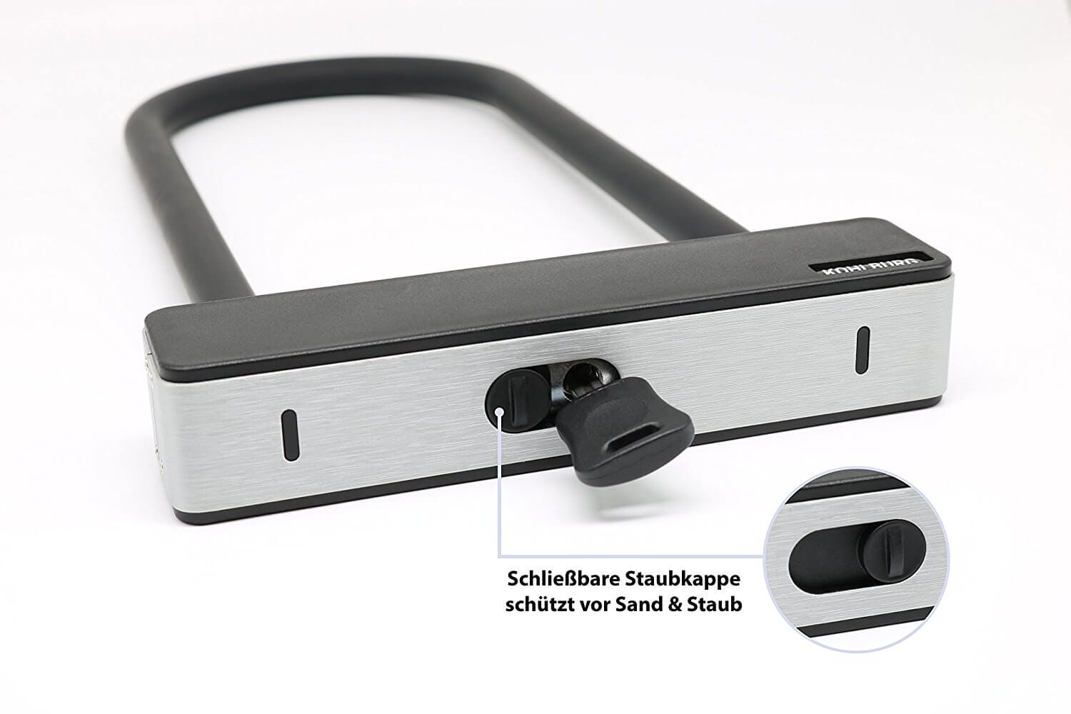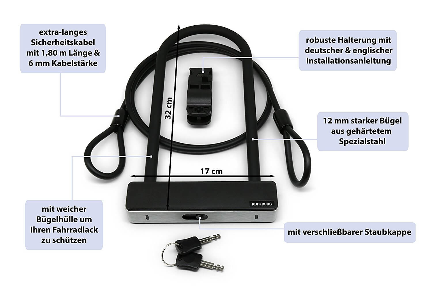 - EXTRA-GROßES BÜGELSCHLOSS – Bügelschlösser sind die mit Abstand sicherste Schlossklasse, bieten aber aufgrund ihrer geringen Größe oft nur wenig Flexibilität beim Anschließen; anders das KOHLBURG Bügelschloss: seine Länge von 32 cm ermöglicht ein einfacheres und gleichzeitig sicheres Anschließen