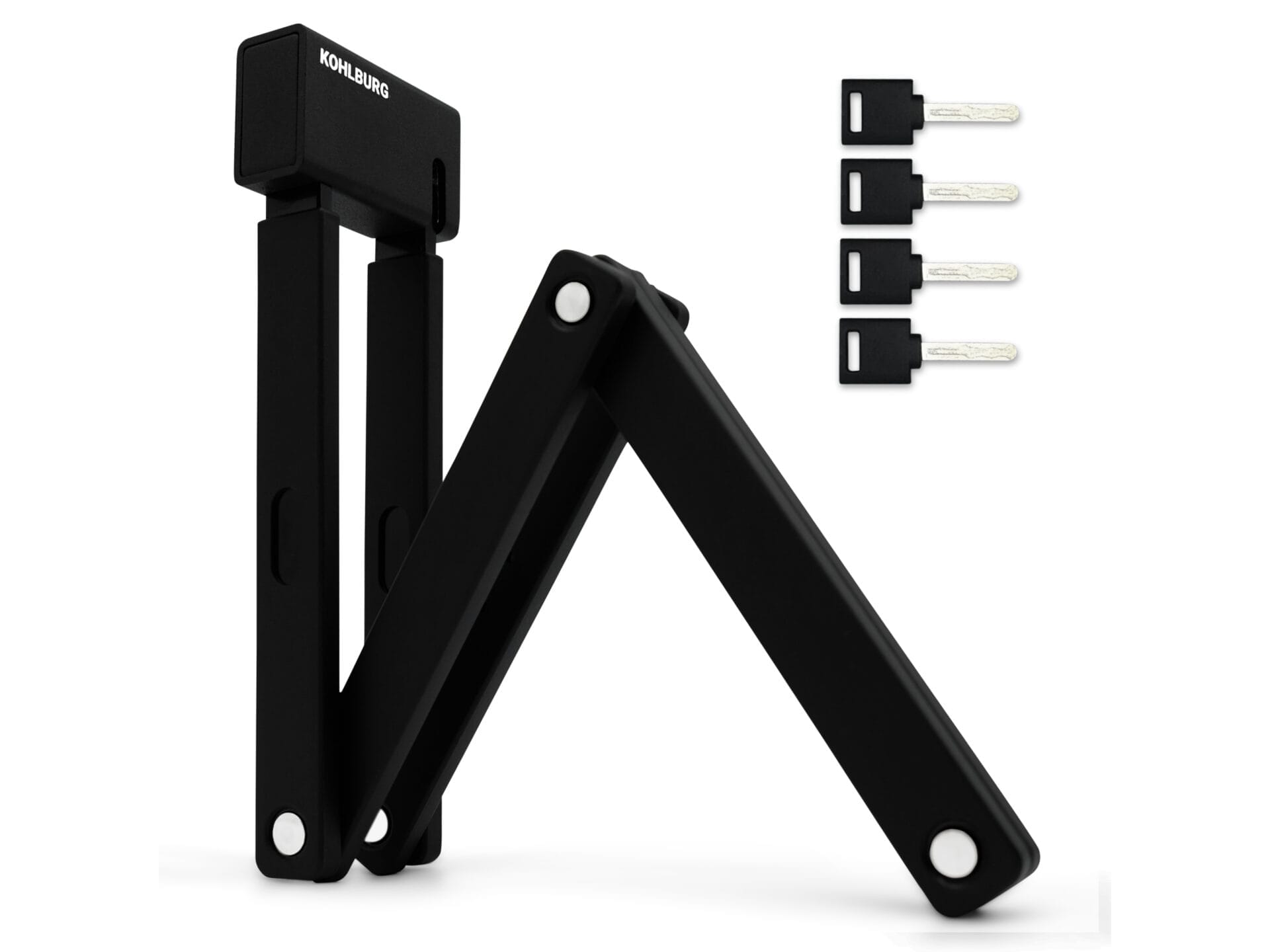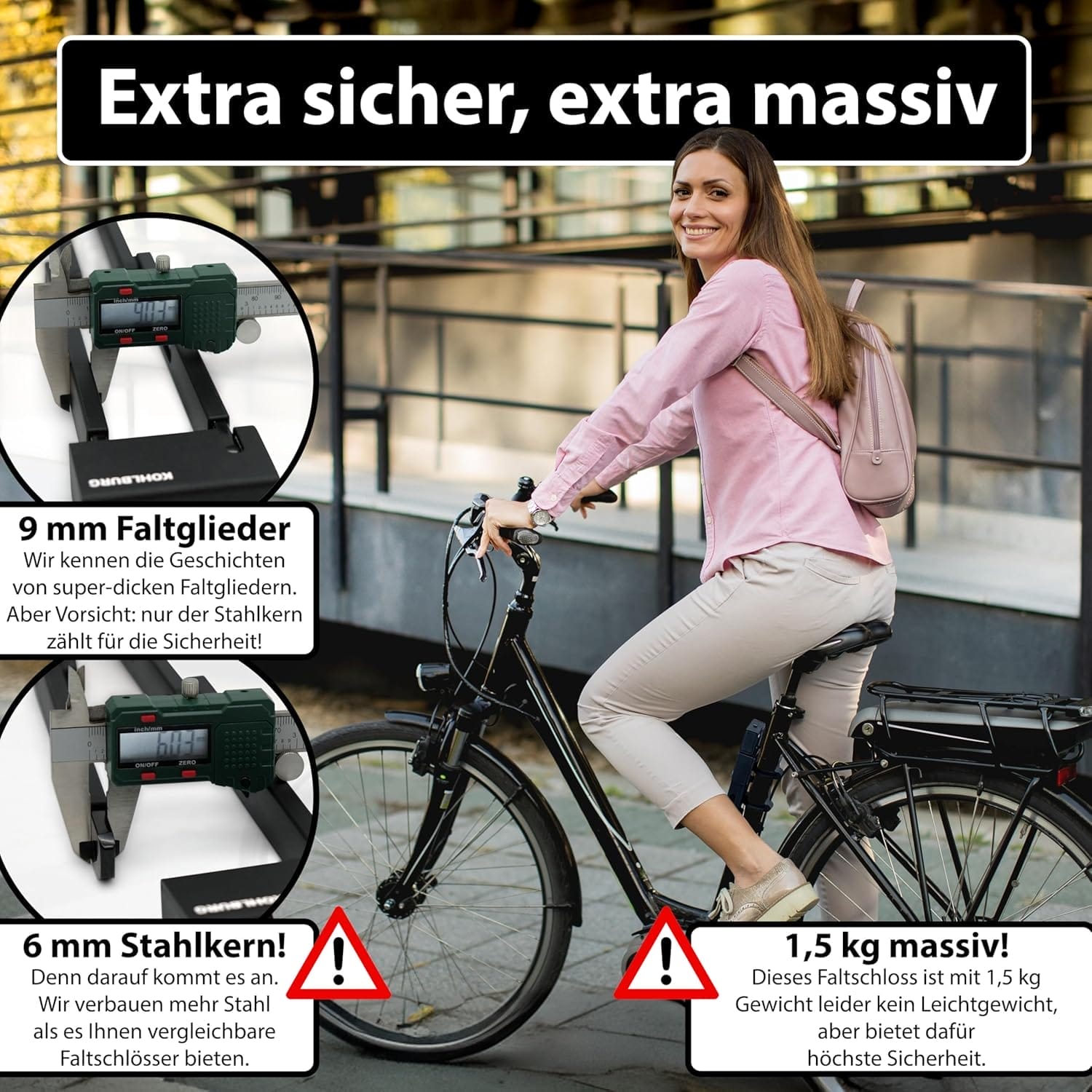 Um Schutz vor Bolzenschneidern und Metallsägen zu bieten, ist der Härtegrad Ihres Schlosses entscheidend. Anders als viele Billigimporte bestehen die Faltglieder dieses KOHLBURG-Schlosses aus gehärtetem Spezialstahl. Damit bietet das Schloss einen sehr hohen Schutz gegen Diebstahl. Bitte beachten Sie auch die Details: bei uns garantieren wir einen 6 mm dicken Stahlkern im Inneren der Faltglieder plus 3 mm Schutzhülle. Bei vielen anderen Faltschlössern ist die Schutzhülle meist dicker als der Stahlkern – achten Sie mal drauf und messen Sie mal nach. Wir garantieren höchste Fahrradschloss-Sicherheit.