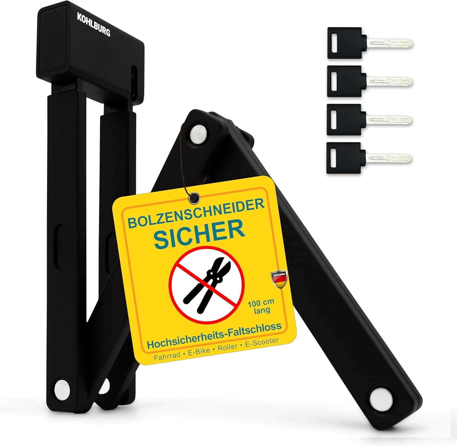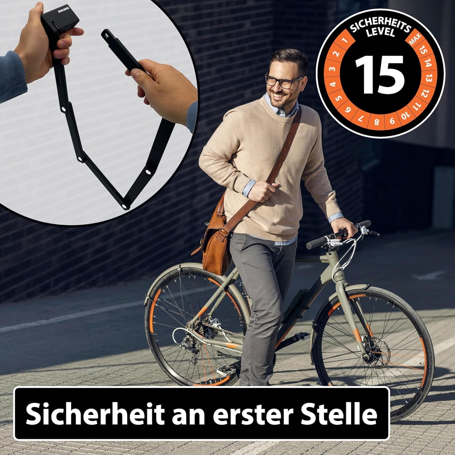 - SICHERHEITSSTUFE 15 – Dieses Gliederschloss bietet die höchste Diebstahl Sicherheit, die ein sicheres Faltschloss bieten kann. Hochwertigste Metall-Komponenten in Schlosskopf, Bohrschutz, Nieten sowie sichere 9mm dicke Faltglieder mit 6mm Spezial-Stahlkern ermöglichen besten Schutz gegen Angriffe, ideal für hochwertige Fahrräder, Ebike, e Roller, Scooter & andere Zweiräder
