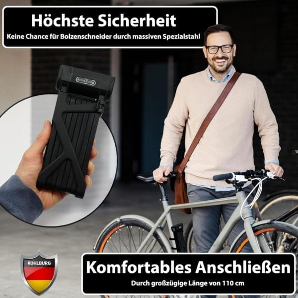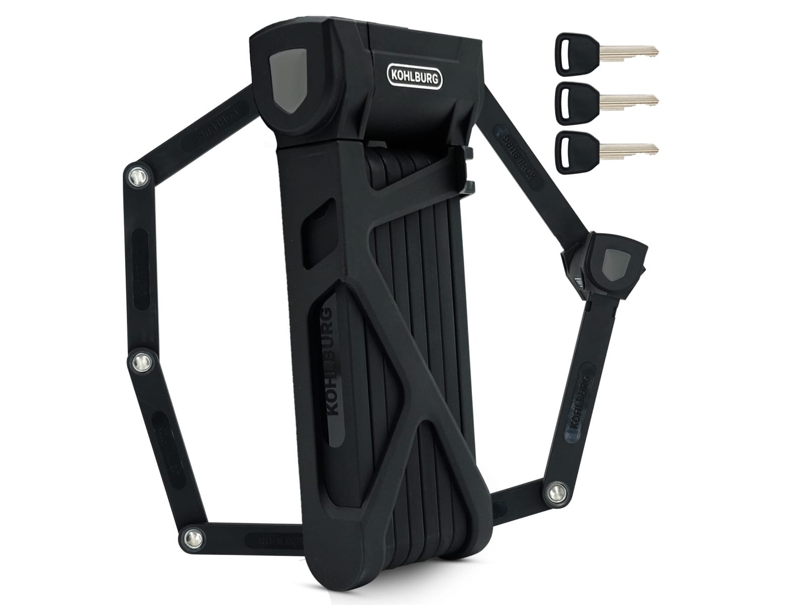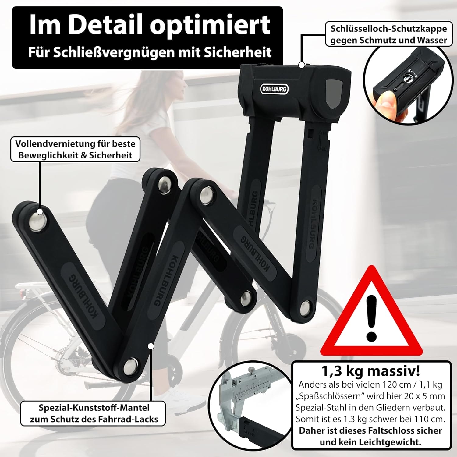 - SICHERHEITSSCHLOSS OHNE SCHNICKSCHNACK – Gehärteter Spezialstahl, Vollendvernietung & Sicherheitszylinder machen das Kohlburg Faltschloss vom Typ Rom zu einem der sichersten Fahrradschlösser. Ein Fahrrad Schloss als echte Diebstahlsicherung für Ihr Zweirad gegen Bolzenschneider, Hammer & Metallsägen.