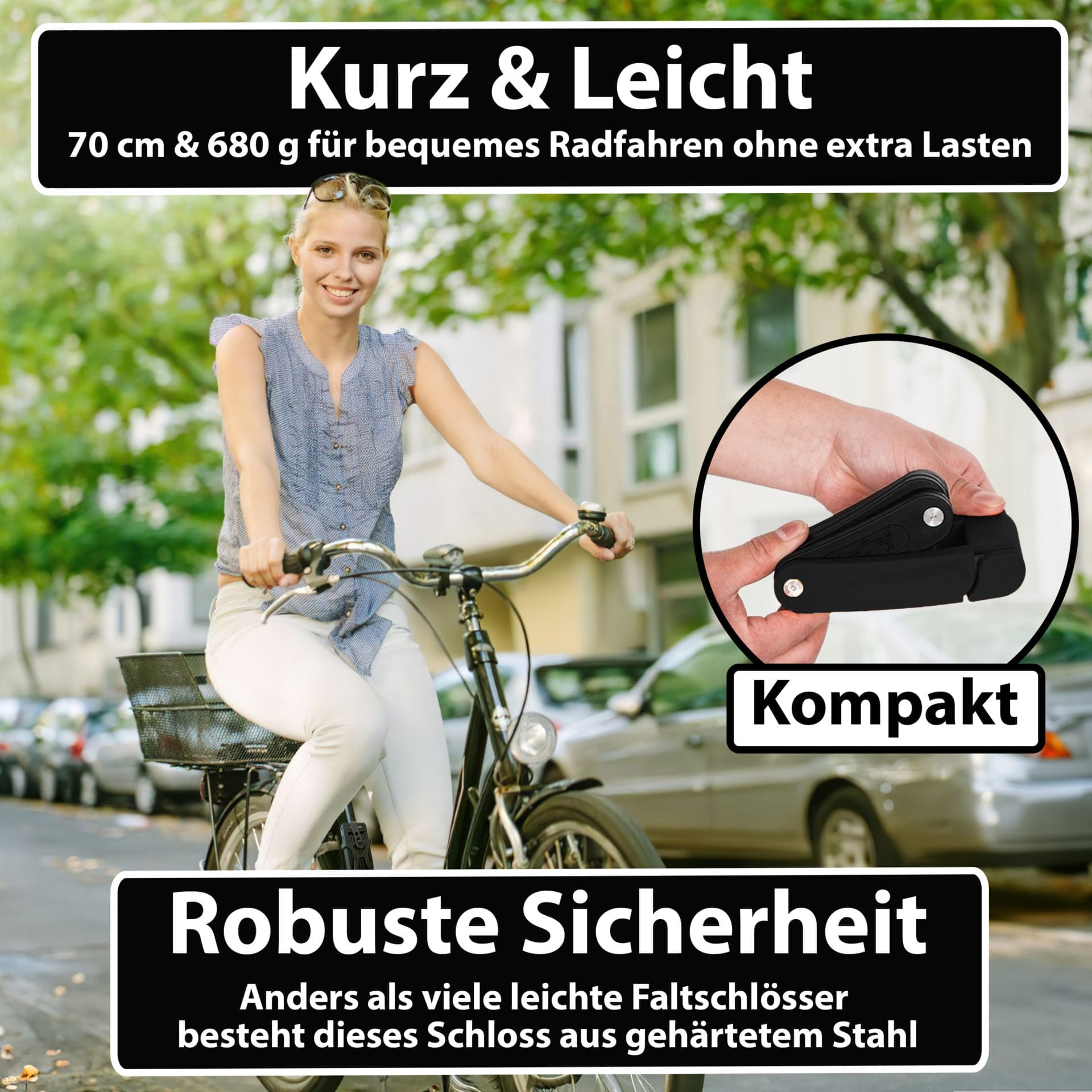- BESONDERS LEICHT – das mit 680 Gramm sehr geringe Gewicht vom Klappschloss ermöglicht bequemes Fahrradfahren ohne extra Lasten – Erleichterung die Sie bei jeder Fahrt spüren; bitte beachten Sie aber auch die kompakte Länge von 70 cm