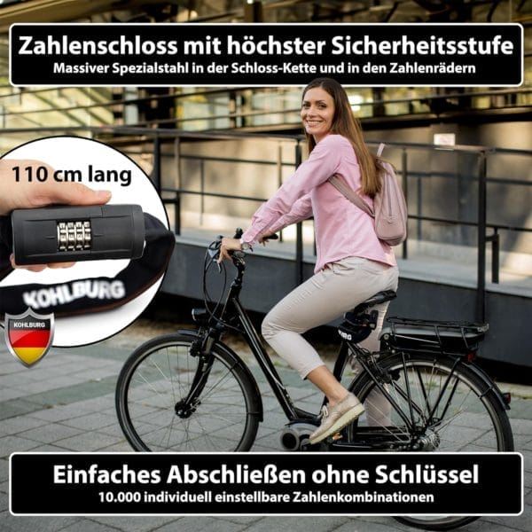 - ENDLICH EIN SICHERES ZAHLENSCHLOSS – Die Stahlkette des KOHLBURG Göteborg besteht aus gehärtetem Spezial-Stahl in 8 mm starken 4-Kant-Gliedern, die hohe Sicherheit gegen Bolzenschneider & Metallsägen bieten. Außerdem sichert ein Schlosskopf mit Zahlenrädern aus Edelstahl (nicht wie üblich aus Plastik) das Fahrradschloss gegen Hammer-Attacken
