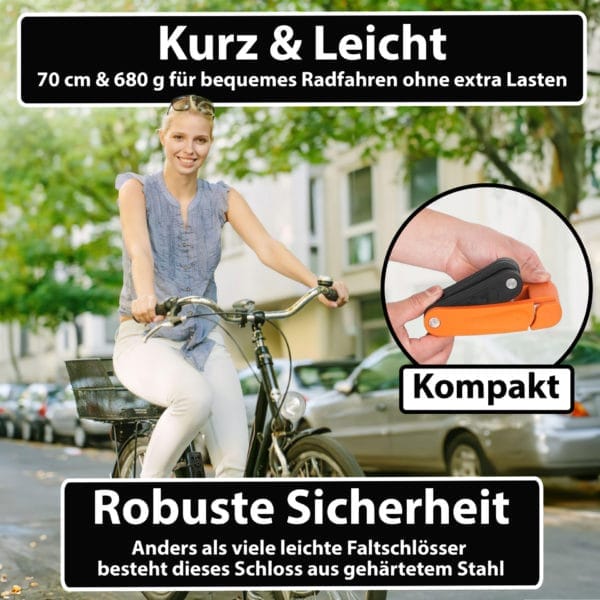 - BESONDERS LEICHT – das mit 680 Gramm sehr geringe Gewicht vom Klappschloss ermöglicht bequemes Fahrradfahren ohne extra Lasten – Erleichterung die Sie bei jeder Fahrt spüren; bitte beachten Sie die kompakte Länge von 70 cm dieses Schlosses
