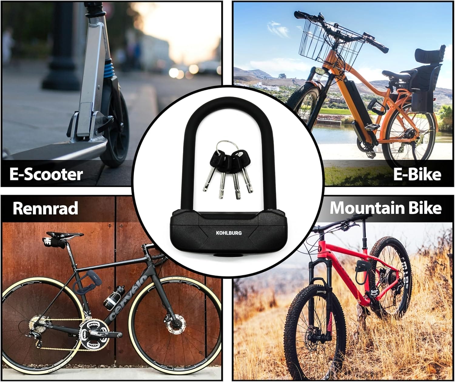Unsere 2-Wege Halterung macht das Anbringen des Schlosses an Ihrem Zweirad mühelos und vor allem flexibel. Ob Sie ein Stadtradfahrer oder ein leidenschaftlicher Geländeprofi sind, unser Bügel-Schloss lässt sich an Ihren Fahrstil anpassen. Damit ist das KOHLBURG Sicherheits-Bügelschloss ideal für alle Arten von Zweirädern, egal ob E-Bike, Mountainbike, Rennrad, Citybike oder eScooter.