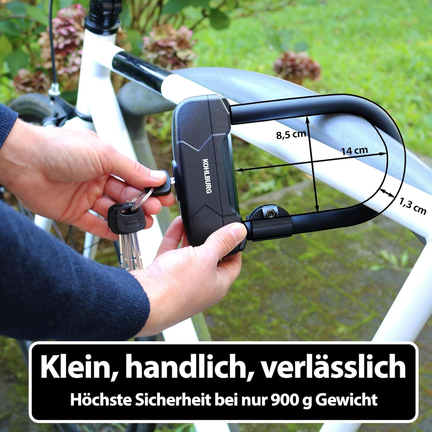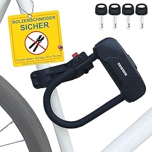 - HÖCHSTE SICHERHEITSSTUFE 15 FÜR KLEINES GEWICHT – Dank des 13 mm starken Bügels aus gehärtetem Spezialstahl besitzt das kleine Bügelschloss unser höchstes Sicherheits-Level 15 für Fahrradschlösser. Damit bietet das Schloss höchste Sicherheit für unter 1 kg Gewicht. Sicherer Schutz für Ihr Fahrrad, Rennrad, Ebike und e Scooter vor Bolzenschneider & Metallsägen.