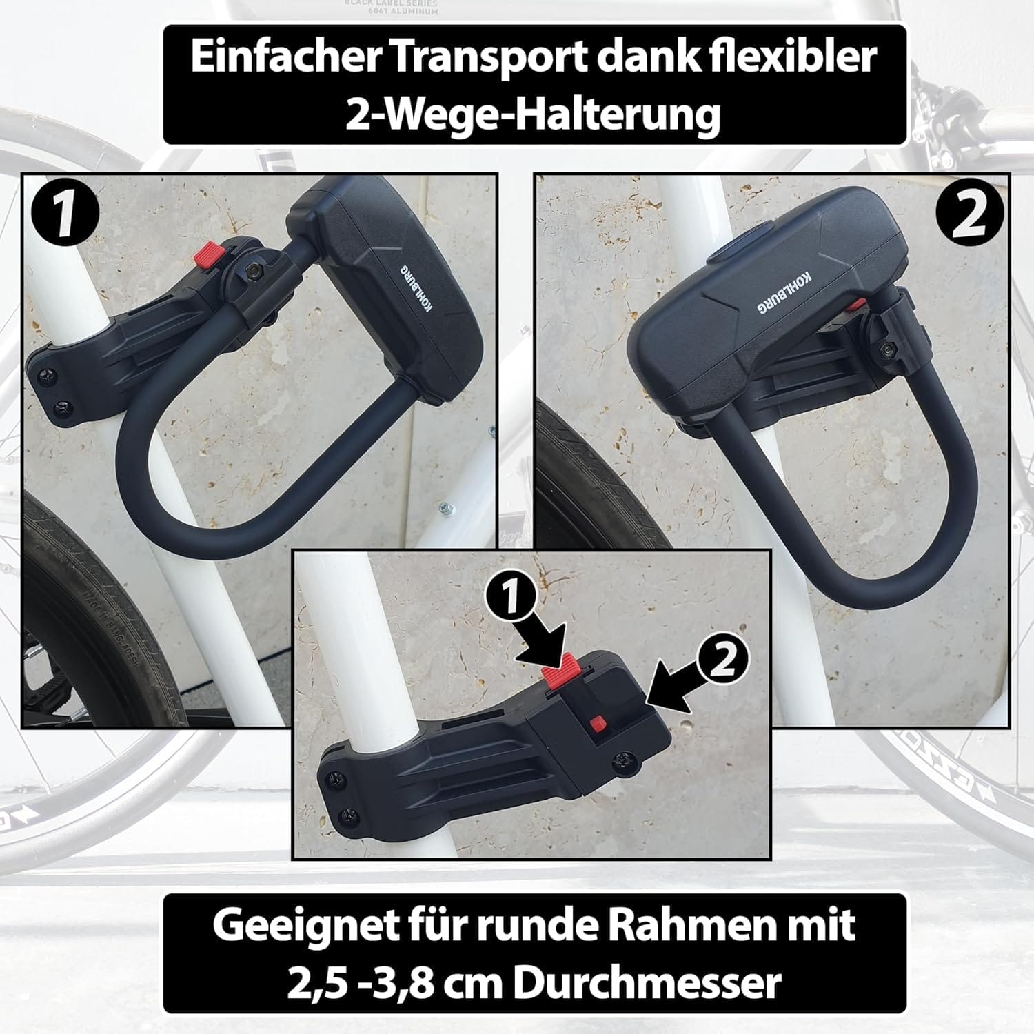 - Klapperfreie 2-Wege Halterung für mehr Möglichkeiten des Transportes; Halterung nur für runde Fahrradrahmen mit einem Durchmesser von 25 – 38 mm