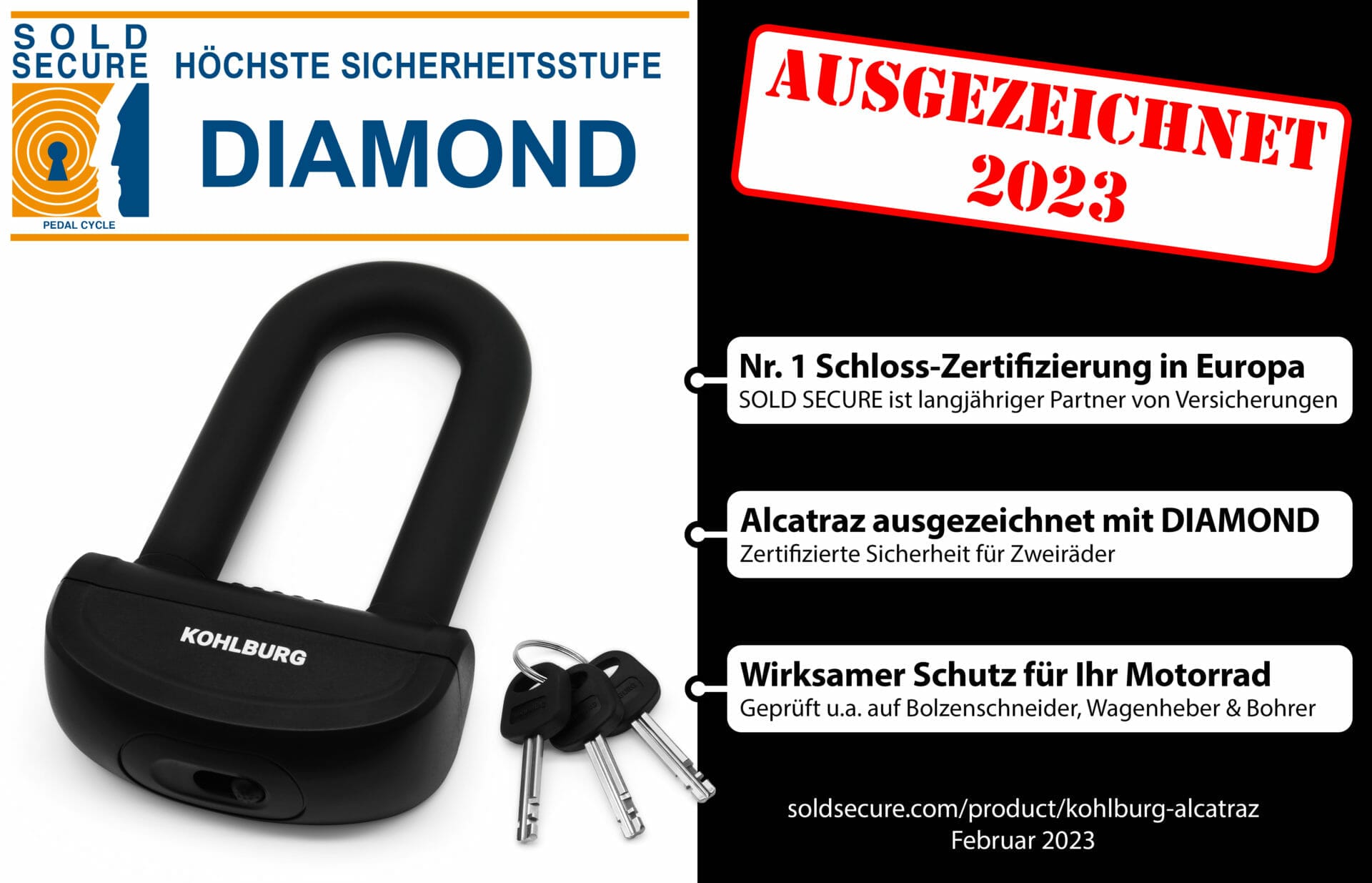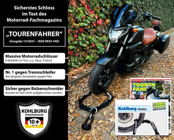 - SICHERSTES SCHLOSS IM TEST – Im Test des Motorrad-Fachmagazins “Tourenfahrer” hielt das Schloss am längsten gegen die Flex stand und konnte nicht von Bolzenschneider und Metallsägen geknackt werden (Ausgabe 12/2021 – ISSN 0933-440, 6 hochwertige Motorradschlösser im Test); damit eignet sich das KOHLBURG Alcatraz ideal als Hochsicherheits-Diebstahlschutz; das Schloss wurde ebenfalls getestet und ausgezeichnet vom Verbrauchertestmagazin AllesBeste.de (März 2022)