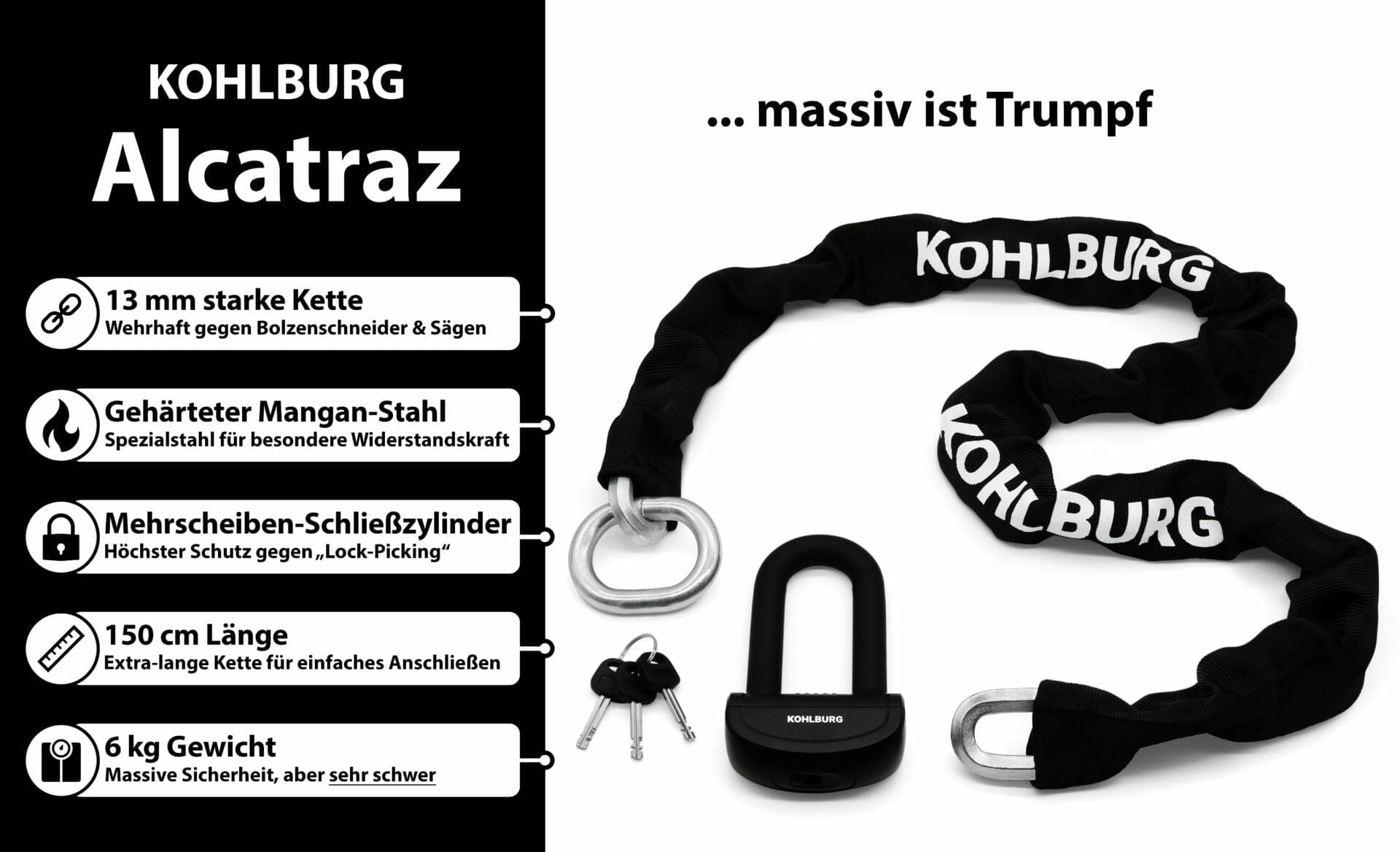 Die Vorteile des KOHLBURG Kettenschlosses vom Typ Alcatraz noch einmal auf einem Blick: