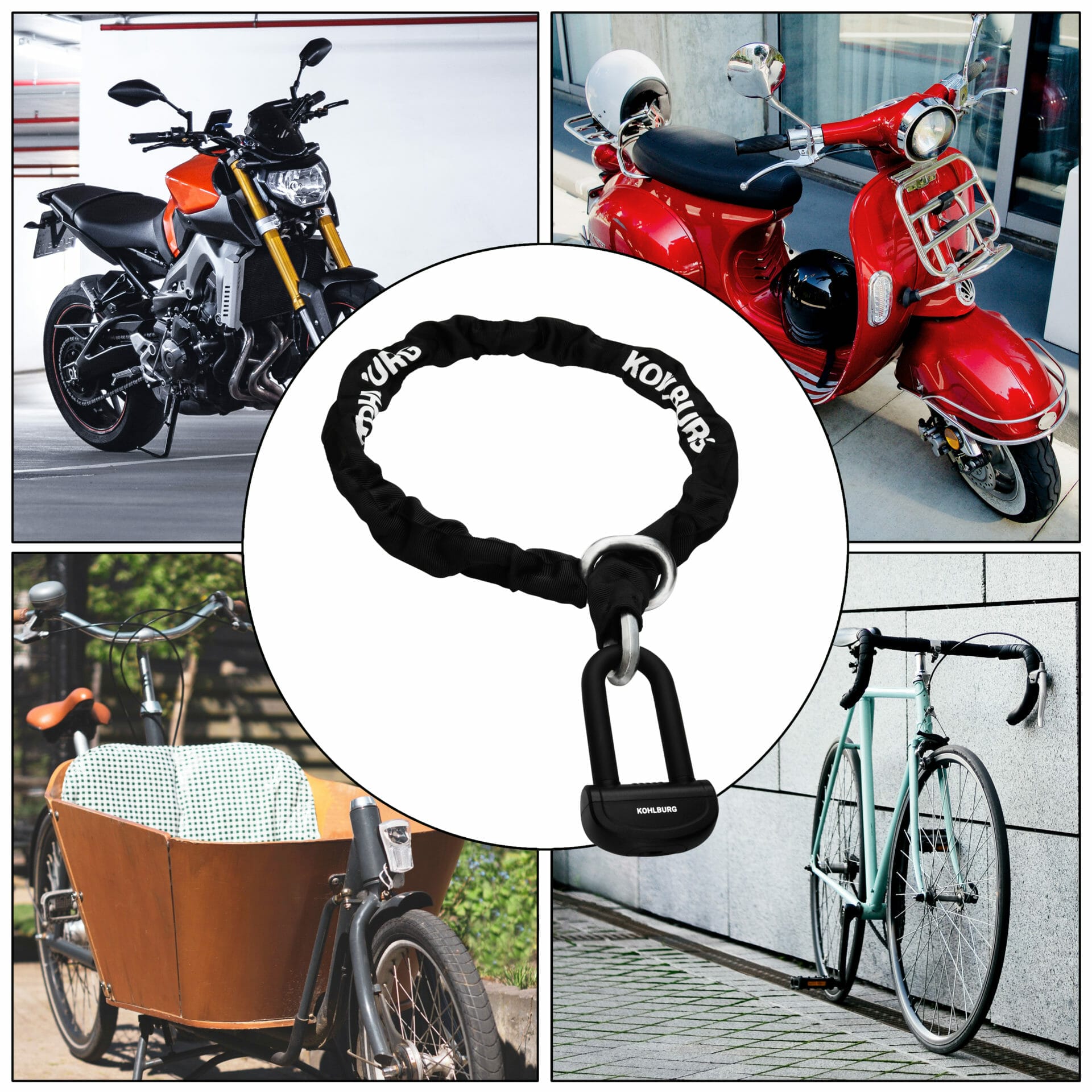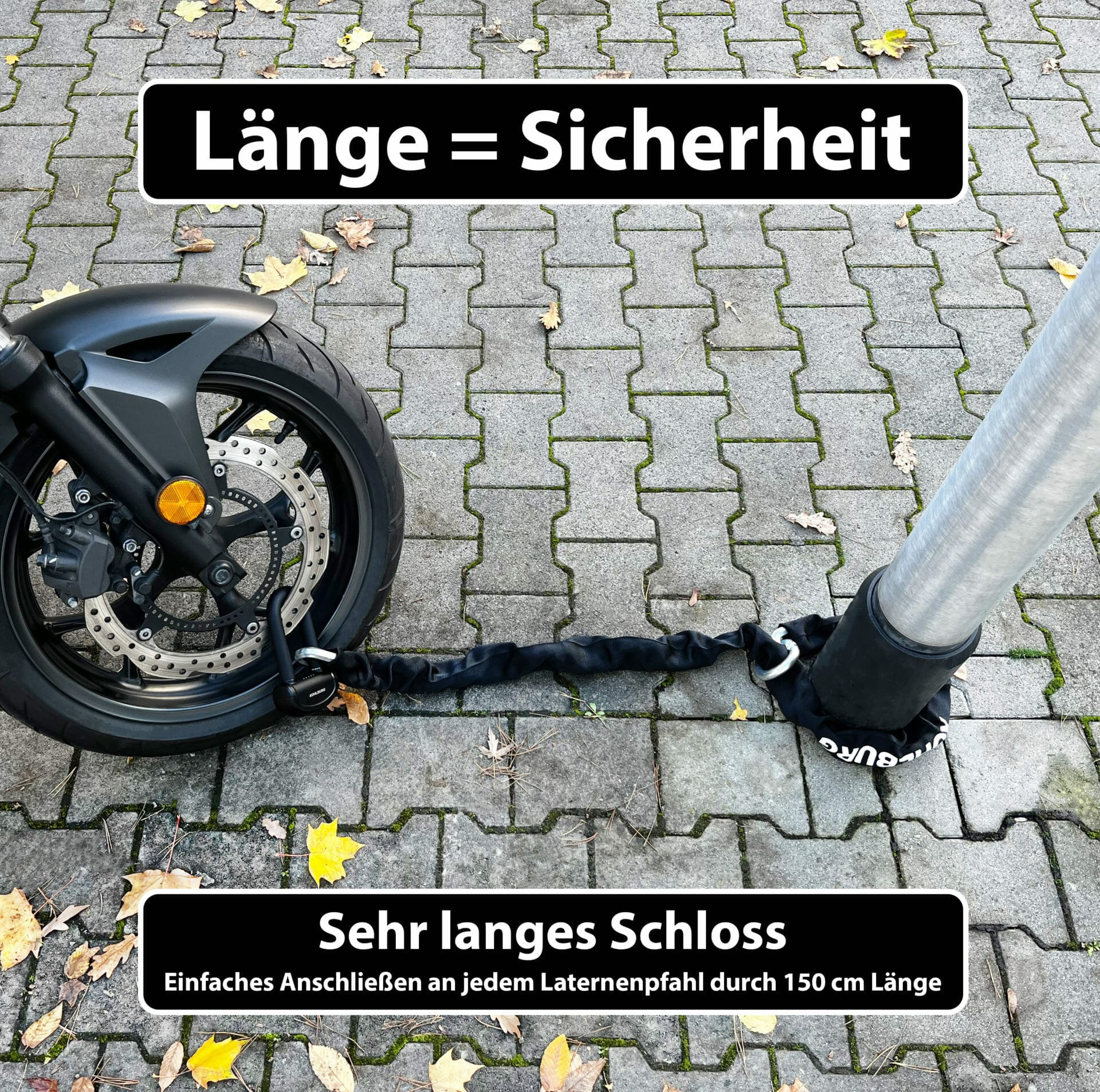 - EXTRA-LANGE KETTE – das Schloss hat eine Länge von 150 cm (140 cm Kette + 6 cm Kettenring + 4 cm Schloss) und ist damit groß genug um Ihr Motorrad auch an breiten Laternen oder sogar Bäumen festzuschließen; ideal auch als Security Schloss für Moped, Mofa, Roller Kettenschloss, Vespa Schloss, Scooter, Motorroller, Pedelec, Krad, als Quad-Schloss und Mopedschloss sowie als Kettenschloss zum stationären Schutz für das hochwertige Fahrrad E-Bike Lastenräder Fahrradschloss E Roller Fahrradanhänger und als Absperrschloss für E Scooter