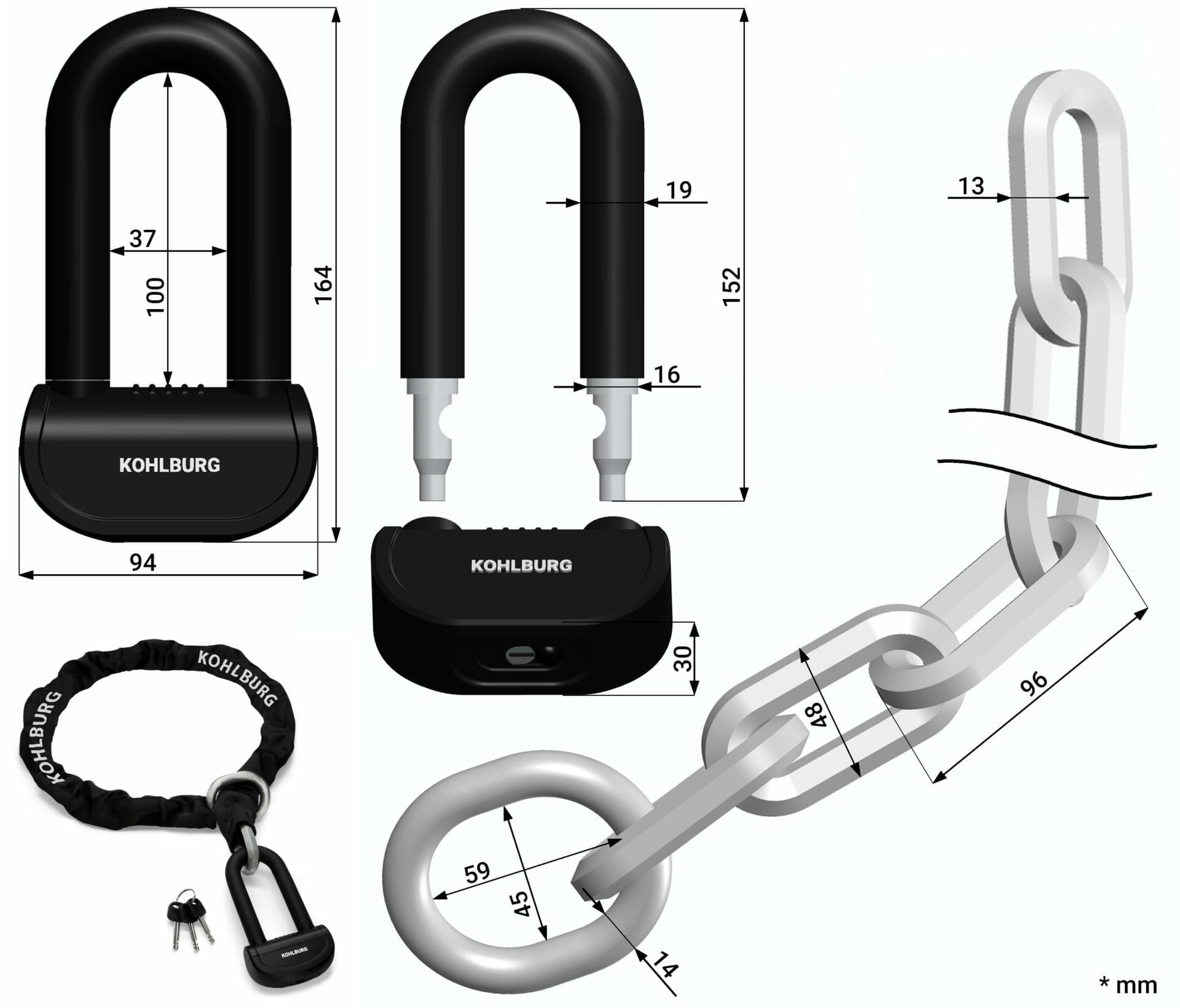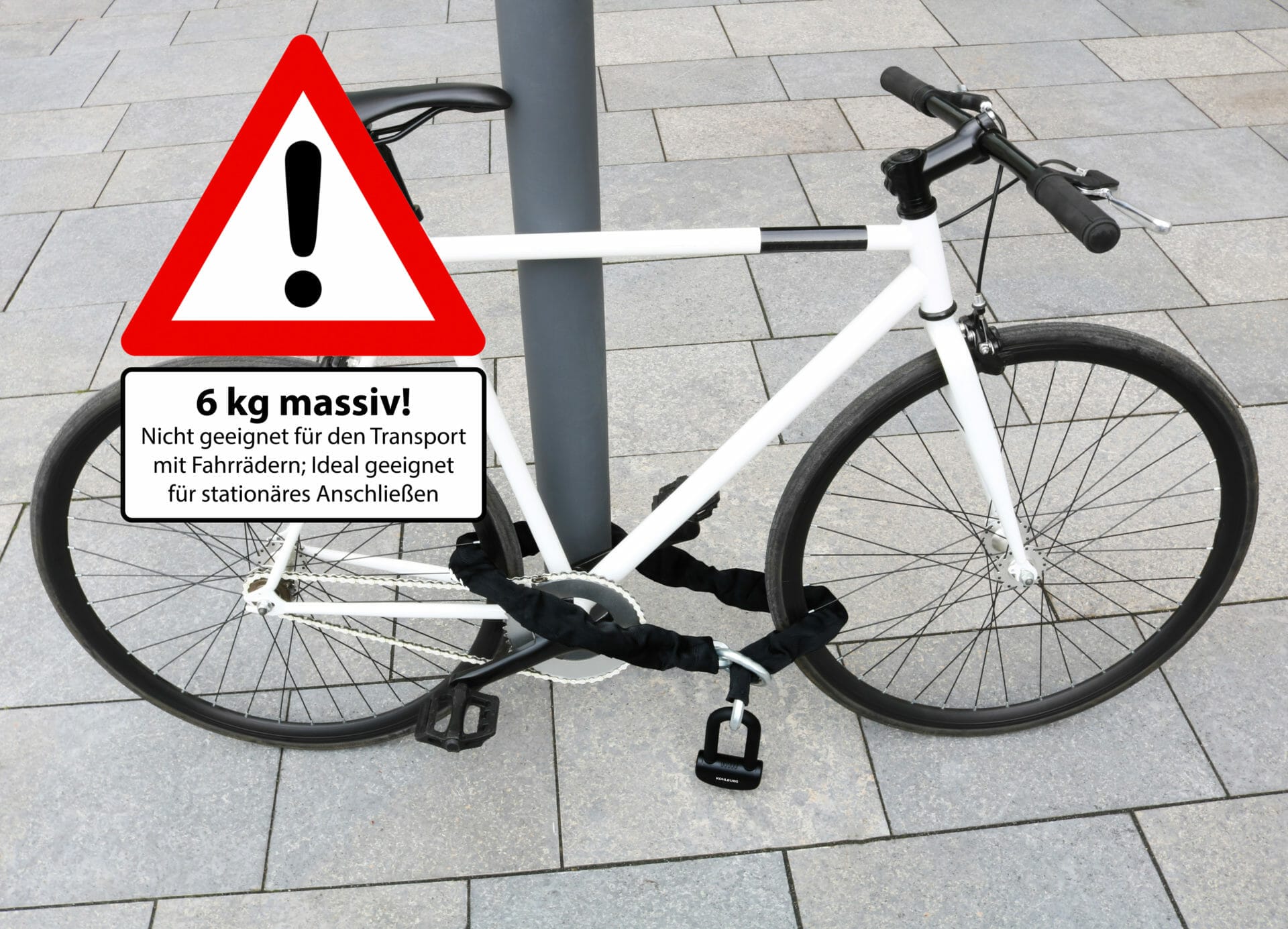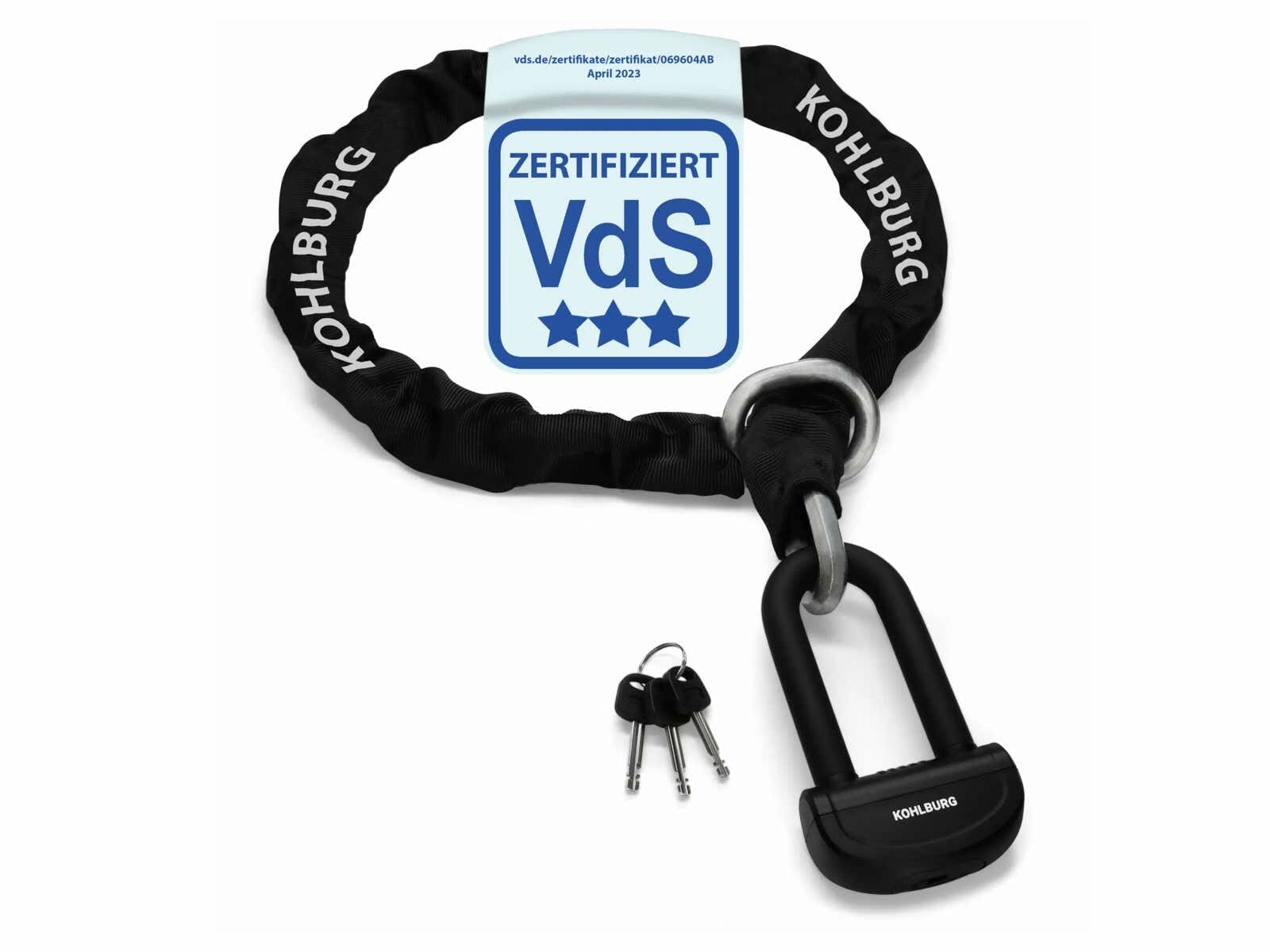 Je länger die Kette, desto sicherer gelingt das Anschließen an feste Gegenstände. Das KOHLBURG-Schloss kann hier eine sehr komfortable Länge von 150 cm (140 cm Kette + 6 cm Kettenring + 4 cm Schloss) vorweisen, die ein stressloses Festschließen auch an besonders breiten Gegenständen wie Straßenlaternen ermöglicht.