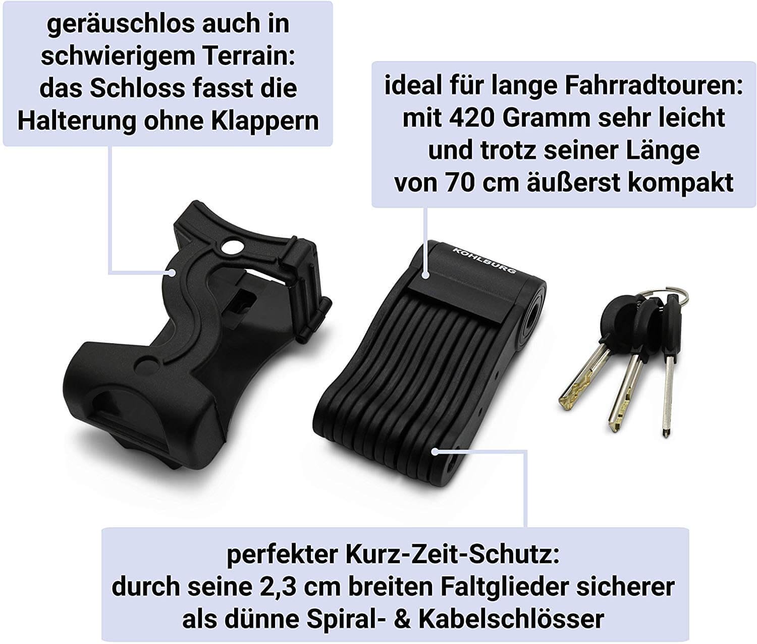 Ein echtes Leichtgewicht für Ihre Fahrradtouren. Das KOHLBURG Faltschloss Typ Salzburg ist der ideale Begleiter auf Ihren Fahrten – klein, leicht & klapperfrei.
