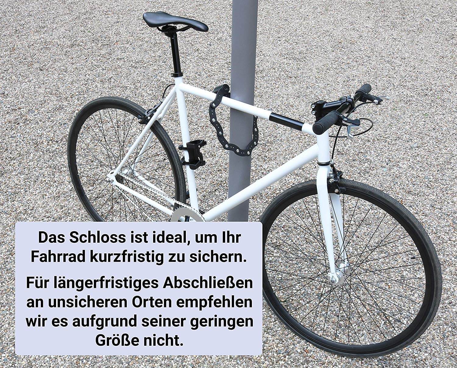 - PERFEKTE KURZ-ZEIT-SICHERUNG – das Schloss hat ein wesentlich höheres Sicherheitslevel als dünne Spiral- & Kabelschlösser und ist ideal um Ihr Fahrrad kurzzeitig zu sichern; aufgrund seiner kompakten Größe empfehlen wir das Schloss aber nicht für das längerfristige Abschließen an unsicheren Orten (z.B. über Nacht am Bahnhof)