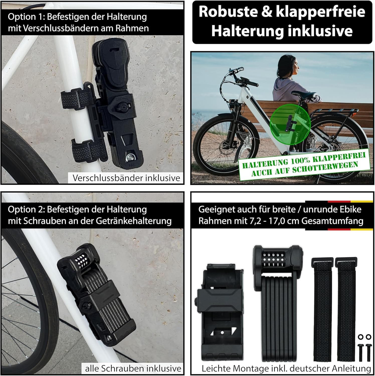 - KEIN KLAPPERN WÄHREND DER FAHRT – Auch auf ruppigen Schotterwegen. Die Halterung wird nach vorne geöffnet und ermöglicht, dass das Fahrradfaltschloss nach vorne entnommen werden kann. Damit kann dieses Fahrradschloss mit Halterung auch an engen Rahmen befestigt werden, anders als viele Konkurrenz-Modelle. Zwei Optionen der Montage: direkt am Rahmen oder an den Löchern des Getränkehalters. Für alle gängigen Fahrrad- & E-Bike-Rahmen (Umfang 7,2 bis 17 cm / Durchmesser 2,3 bis 5,5 cm) + inklusive aller notwendigen Halterungsteile